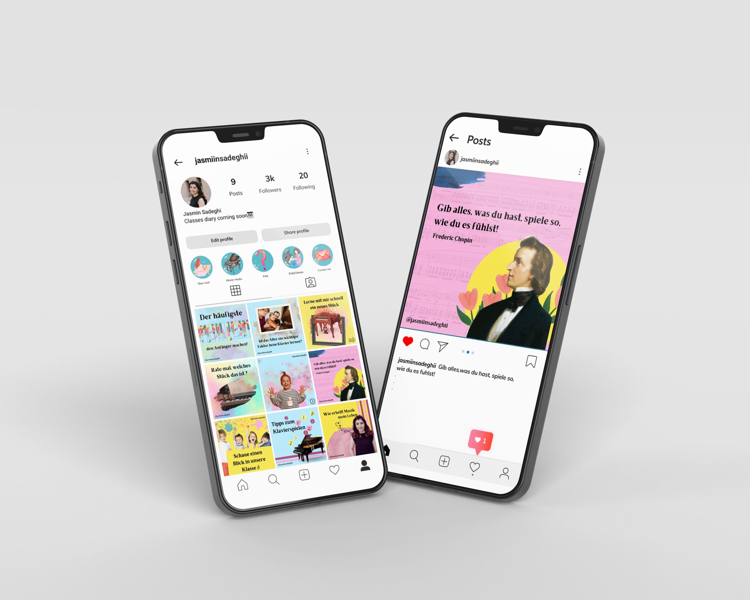 نمونه طراحی صفحه اینستاگرام بیزینس برای مشتری محترم، خانم صادقی در زمینه آموزش موسیقی و پیانو