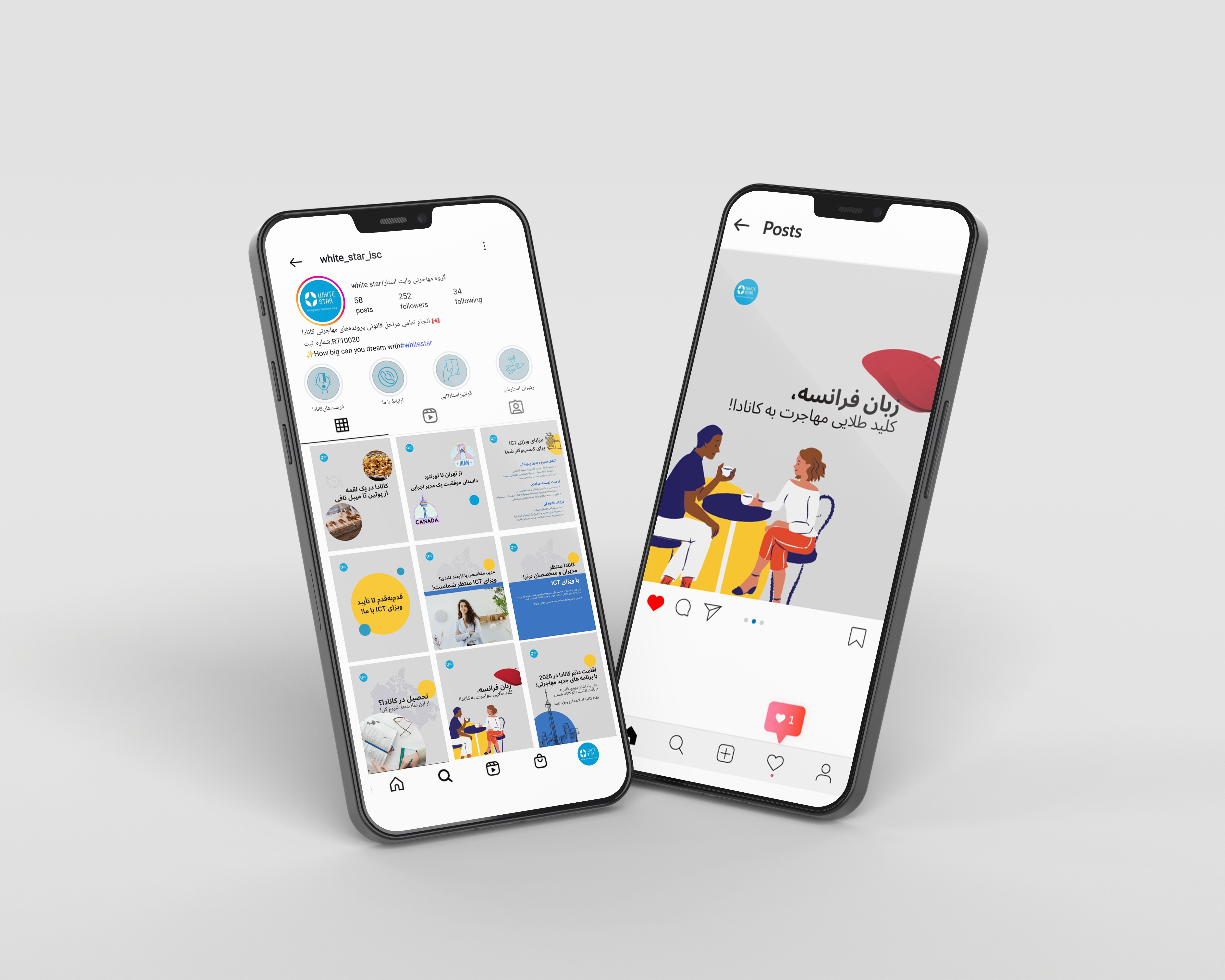 نمونه طراحی صفحه اینستاگرام بیزینس برای گروه مهاجرتی White Star به مدیریت خانم شیرمحمدی، با هدف معرفی خدمات تخصصی مهاجرت به کانادا و تولید محتوای مرتبط با قوانین، روشهای مهاجرتی، اقامت، و زندگی در این کشور انجام شد.